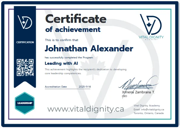 Finalizamos el proceso validando que has dominado las habilidades del programa. Se te otorga la Doble Certificación Internacional de Vital Dignity (Canadá) y Doctrina Qualitas (Europa), lista para ser integrada en tu CV y LinkedIn con código QR de verificación.